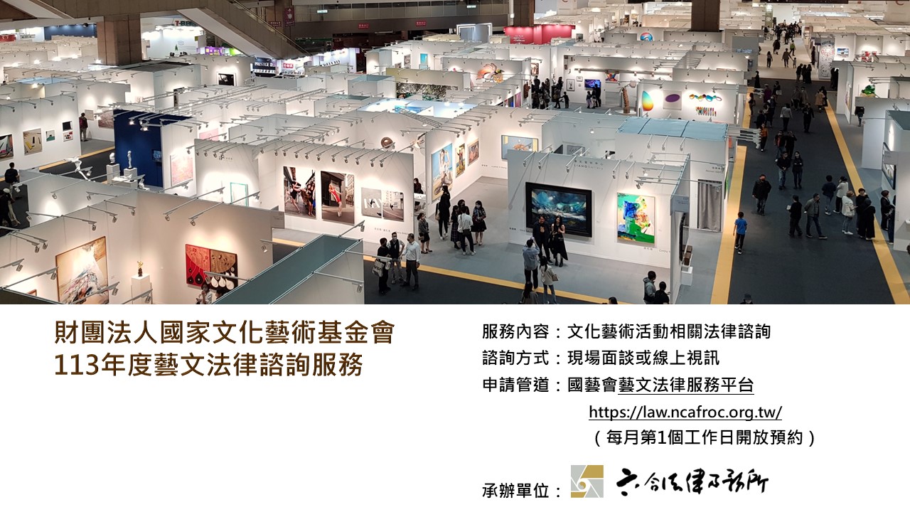 本所經審議通過為國藝會「113年度藝文法律諮詢服務」計畫合作單位, 自113年1月起,透過國藝會「藝文法律服務平台」提供預約法律諮詢服務。 服務內容:文化藝術活動相關法律諮詢 諮詢方式:現場面談或線上視訊 申請管道:國藝會藝文法律服務平台 (每月第1個工作日開放預約)